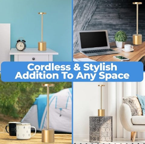 Slim, modern table lamp with a metal body and cordless design. Built-in rechargeable battery (USB 5V) and 24 warm LEDs give cozy ambient light anywhere. Touch top to turn on/off and smoothly adjust brightness. Ideal for bedrooms, cafés, restaurants, or study tables.