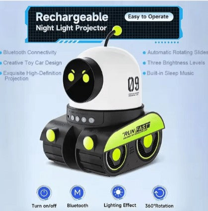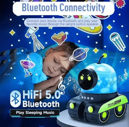 Description Robot Projection Lamp – A futuristic LED night projector with Bluetooth music playback, designed to transform your space into a starry galaxy while adding a sci-fi touch to your decor.